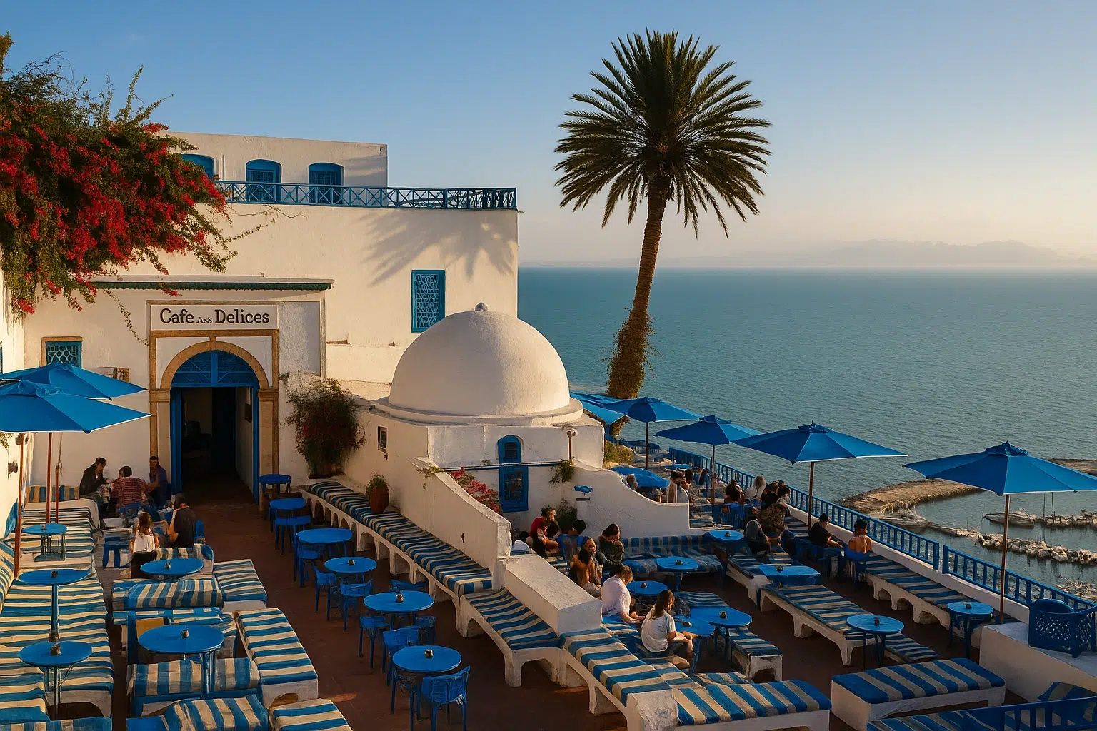 چشم‌انداز دریایی کافه معروف در سفر به سیدی بو سعید