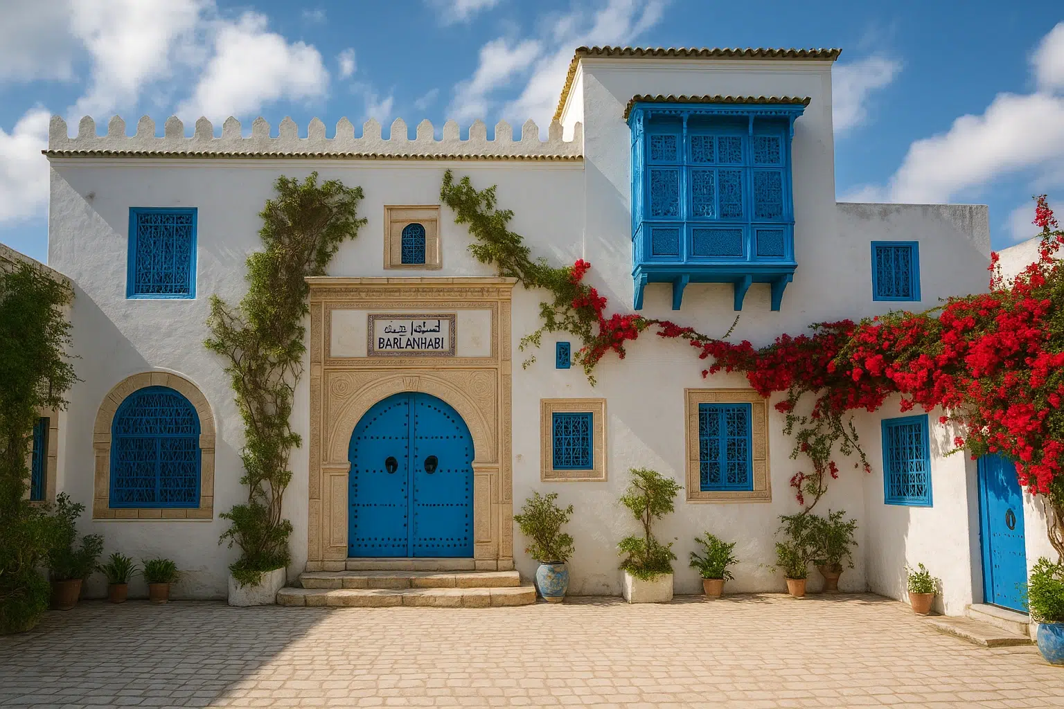 خانه‌های سنتی با درهای آبی و گلدان‌های سفالی در مسیر سفر به سیدی بو سعید