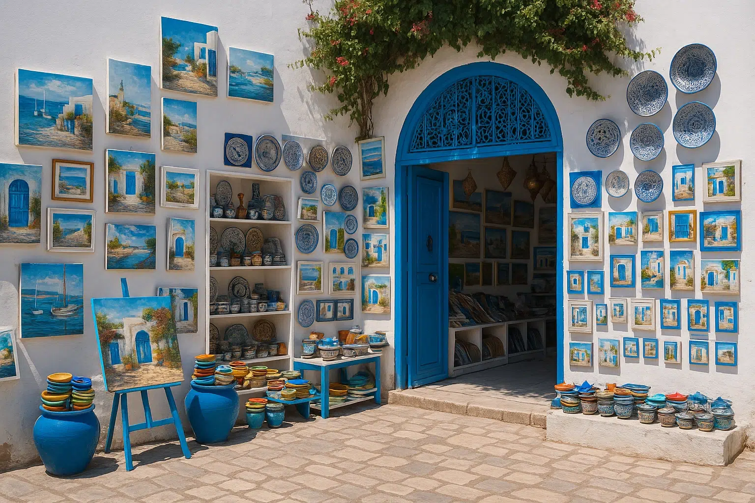 اگر به هنر علاقه‌مندید، سفر به سیدی بو سعید بدون بازدید از گالری‌ها و کارگاه‌های صنایع دستی معنا ندارد. این شهر خانه هنرمندان محلی است که آثار نقاشی، سفال و زیورآلات خاص تونسی را با عشق می‌آفرینند. خرید یک یادگاری هنری از اینجا، بخشی از خاطرات سفر شما خواهد شد.