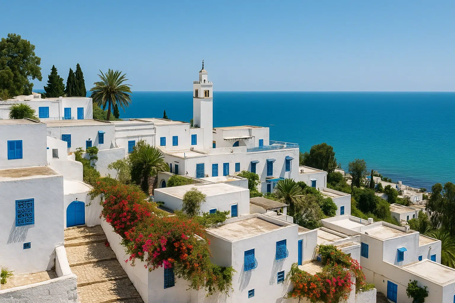 نمای کامل از شهر سفید و آبی در سفر به سیدی بو سعید با چشم‌انداز دریای مدیترانه